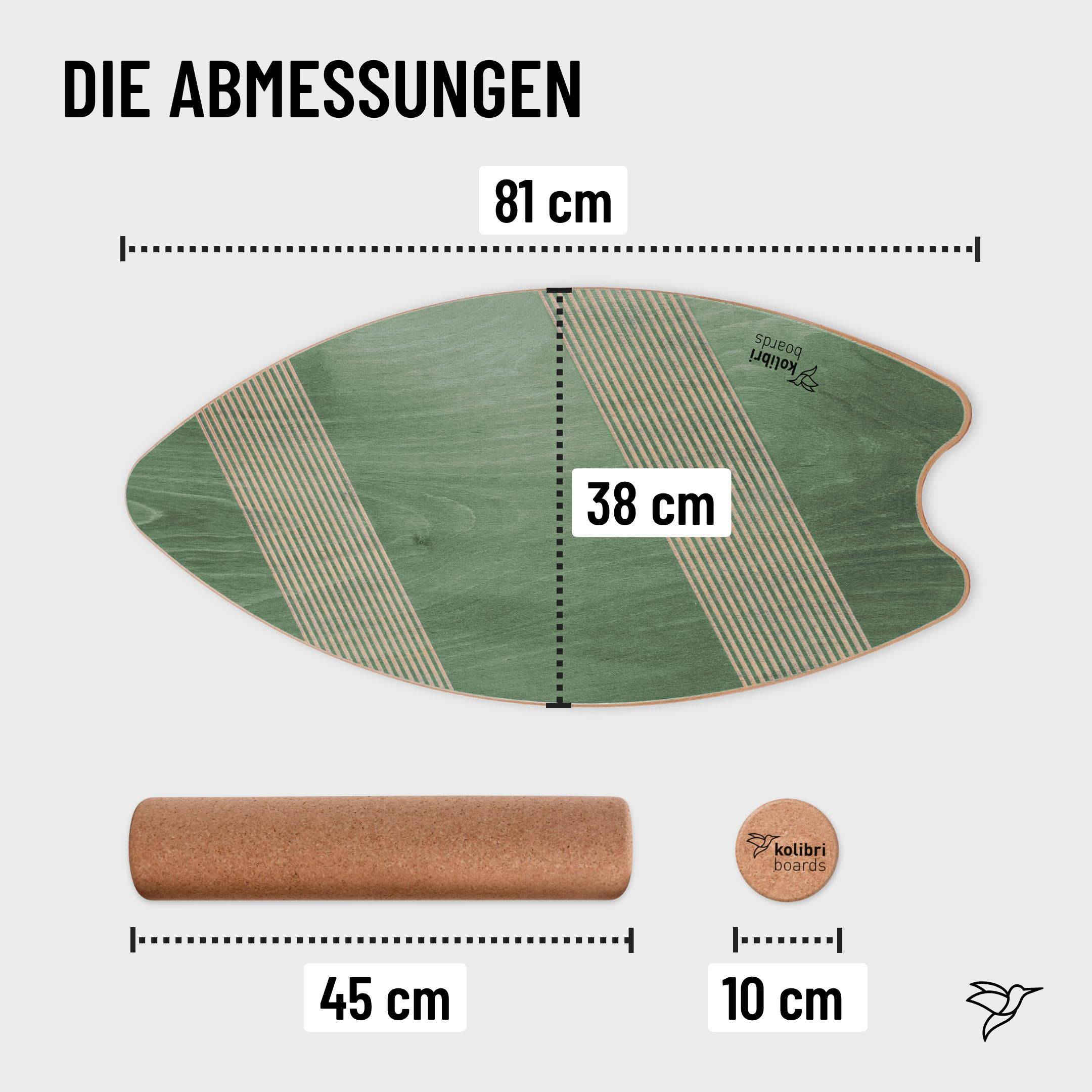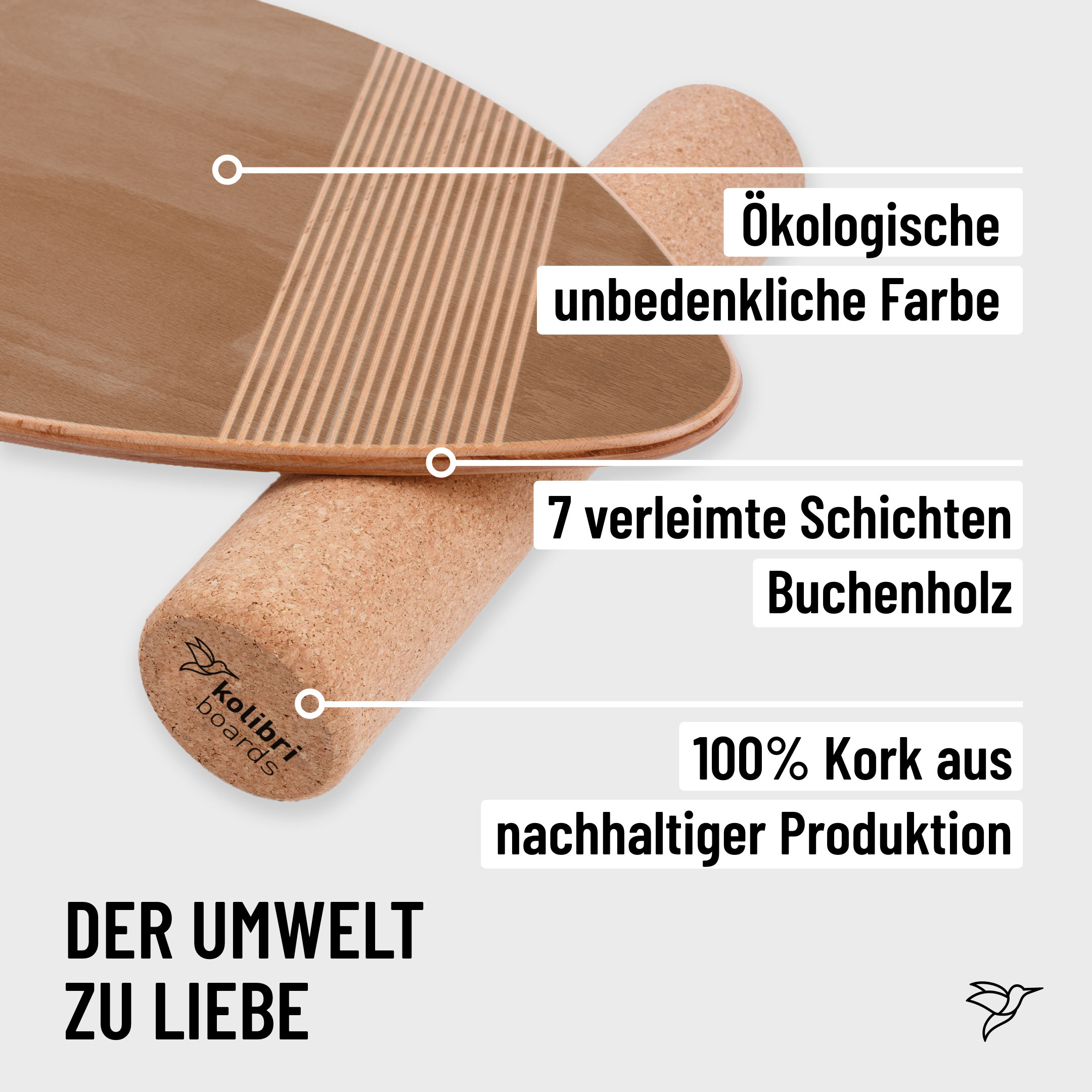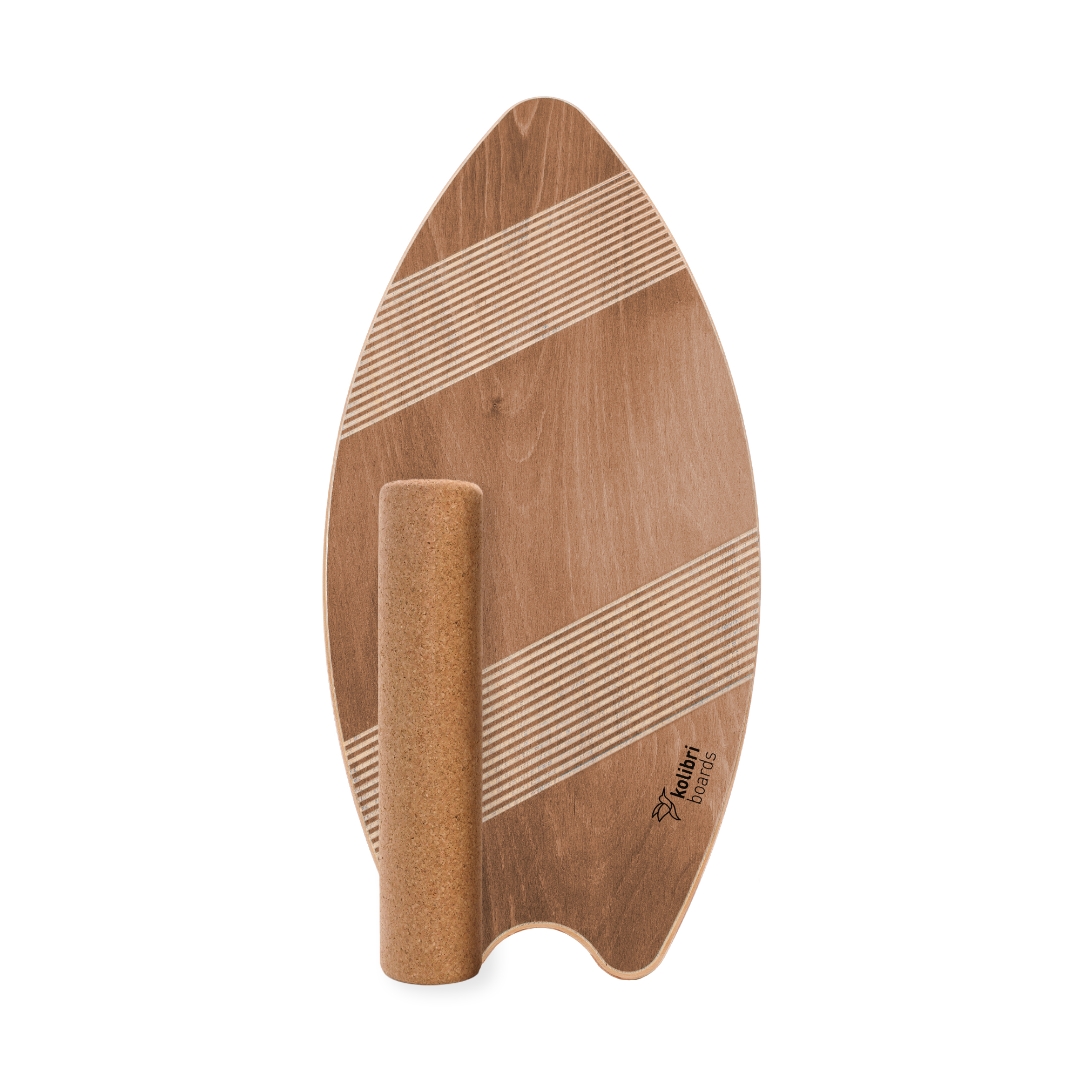 Auch dieses Board überzeugt durch die feinen Rillen auf dem oberen und unteren Drittel, welche einen einzigartigen Halt geben. Das Board besteht aus 7 gegeneinander verleimten Schichten, die aus 100 % Buchenholz bestehen. Das Board ist dadurch sehr stabil und nahezu unkaputtbar. In sorgfältiger Handarbeit wird umweltfreundliche Beize aufgetragen, allerdings nur so fein, dass die wunderschöne Maserung des Holzes sichtbar und somit jedes Board ein Unikat bleibt. In weiterer Handarbeit wird das Board vollständig und fein säuberlich geschliffen. Zum Schutz wird die Vorder- und Rückseite mit einem farblosen Lack umhüllt, so dass dieses wasserresistent ist. Die Korkrolle mit Durchmesser 10cm und Länge 45cm ist aus 100 % Kork hergestellt und wird in Portugal produziert. Ein Gefühl von Leichtigkeit erwartet dich.